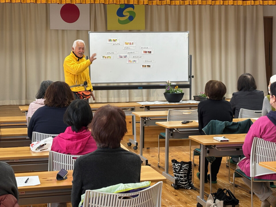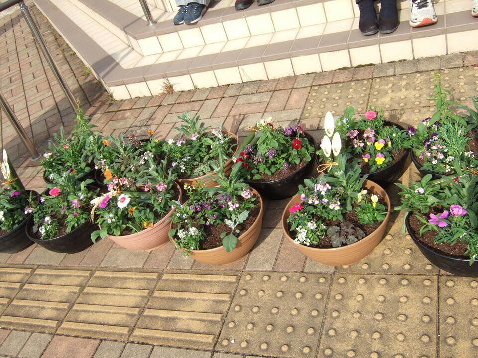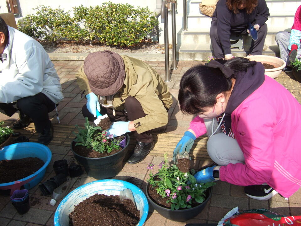 中川達也さん(佐賀市みどりのカウンセラー)を招き、寄植えの講義と実習を行いました。講義では、毒性のある植物についての話は参加者も興味があり、「小さい頃にあったよ」「身近にもあるんだぁ」などの声が上がっていました。また、寄植えのポイントや色の組み合わせ、門松に使う竹の向きについての話を聞いて、どんな寄植えにしようかなぁとイメージをわかせていました。実習では、イメージした色や配置を考えながら苗を選び、それぞれに素敵な寄植えを完成させました。